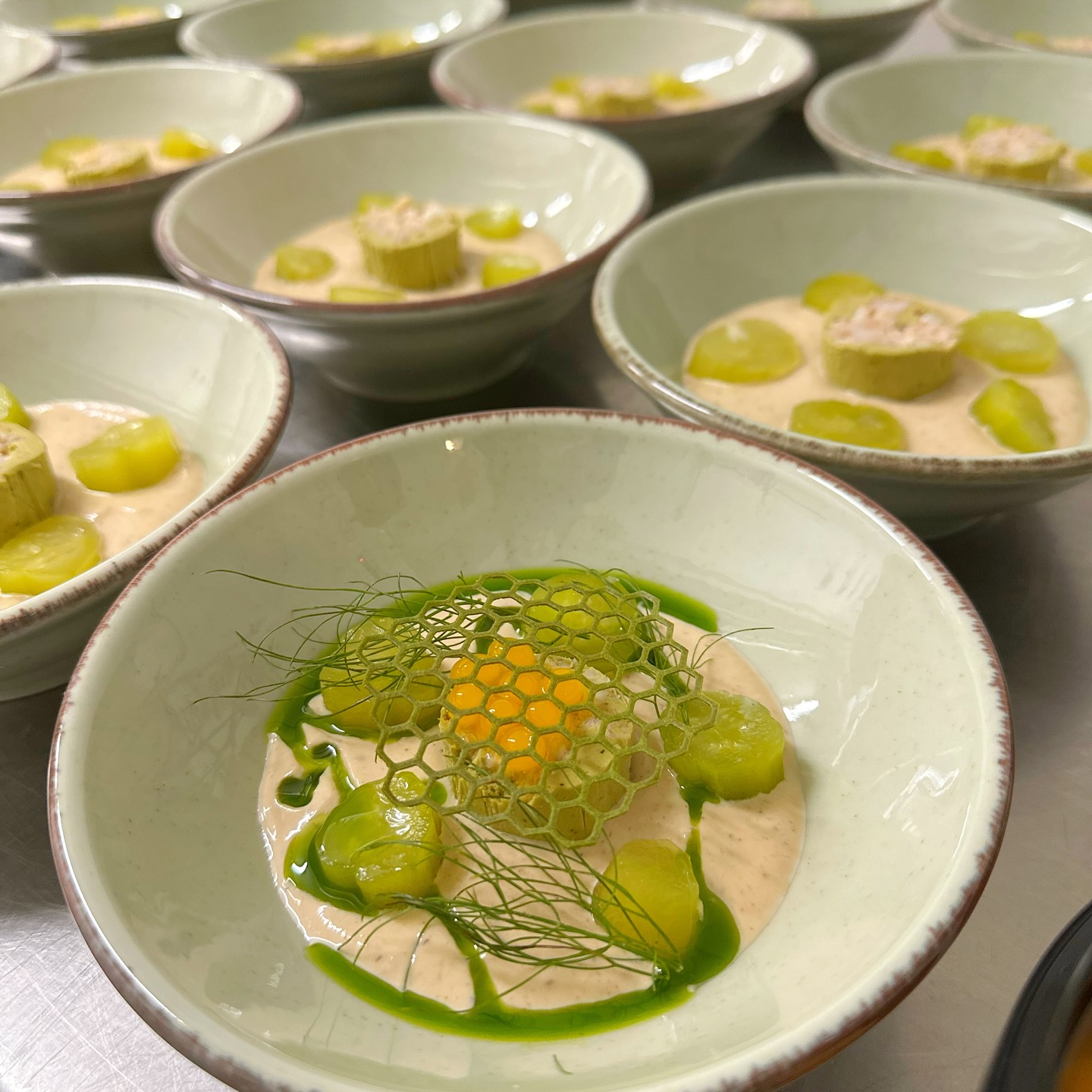 Cremet suppe af jomfruhummer med letrøget færøske kammuslinger og syltede urter.